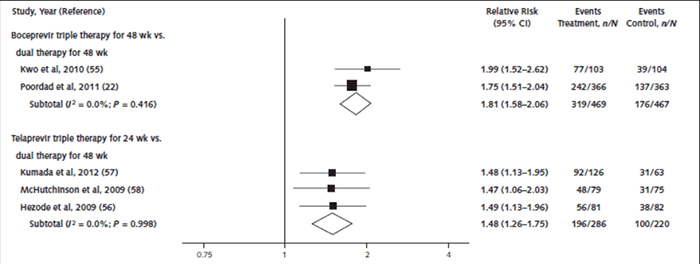 One trial (n = 1088) found response-guided triple therapy with telaprevir (triple therapy for 8 or 12 weeks followed by dual therapy for a total of 24 or 48 weeks, depending on extended rapid virologic response) to be associated with a higher likelihood of SVR than was dual therapy for 48 weeks (RR, 1.6 [CI, 1.4 to 1.9]), with an absolute increase of 25 to 31 percentage points20.