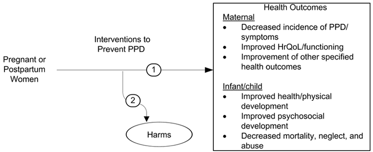 This figure is the analytic framework that depicts the two Key Questions to be addressed in the systematic review. The figure illustrates how interventions to prevent postpartum depression may result in improved health outcomes for both the mother and infant/child, including decreased incidence of postpartum depression; improved quality of life; improved psychosocial development; and decreased mortality, neglect, and abuse (KQ 1). Additionally, the figure depicts whether interventions to prevent postpartum depression are associated with any harms (KQ 2).