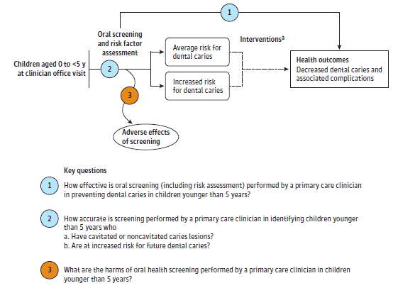 Conclusions and Relevance: There was no direct evidence on benefits and harms of primary care oral health screening or referral to dentist. Dietary fluoride supplementation and fluoride varnish were associated with improved caries outcomes in higher-risk children.
