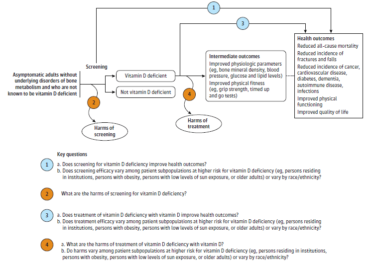 8. LeBlanc E, Chou R, Zakher B, Daeges M, Pappas M. Screening for Vitamin D deficiency: Systematic Review for the U.S. Preventive Services Task Force Recommendation. US Preventive Services Task Force; 2014.