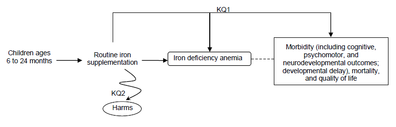 This analytic framework outlines the evidence areas covered in the review, including the population, routine supplementation, and outcomes, on a visual pathway. On the left side of the framework, the population includes all children ages 6 to 24 months. Initially, the framework assesses routine supplementation via an overarching arrow leading to the right side of the framework for the goal of reducing morbidity (including cognitive, psychomotor, and neurodevelopmental outcomes and developmental delay), mortality, and quality of life. Harms of routine supplementation are examined as an offshoot arrow. In the center of the framework is the intended goal for decreased iron deficiency anemia.