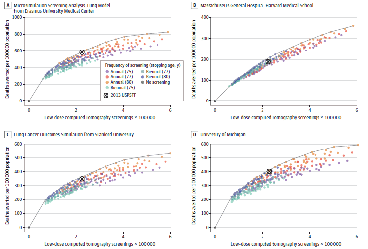 b Individuals were followed up from aged 45 to 90 years. The 4 models were the Microsimulation Screening Analysis-Lung Model from Erasmus University Medical Center, the Massachusetts General Hospital–Harvard Medical School (MGH-HMS) model, the Lung Cancer Outcomes Simulation model from Stanford University, and the University of Michigan (UM) model.
